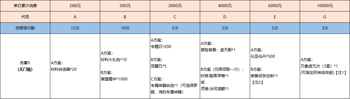 (2)玩家在任一满足累充额度档位里的方案A/B中选择一个进行领取,且只能领取一档奖励,不支持更换其他道具