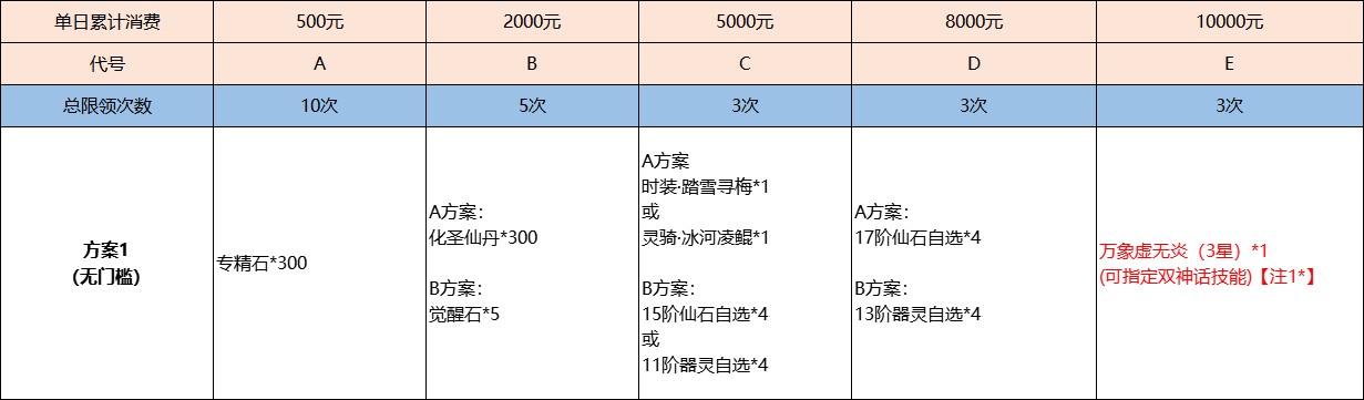 (1)活动期间玩家每日0点-24点累计充值且消费金额满足以下要求,即可选择满足累充额度的任一档位领取奖励。